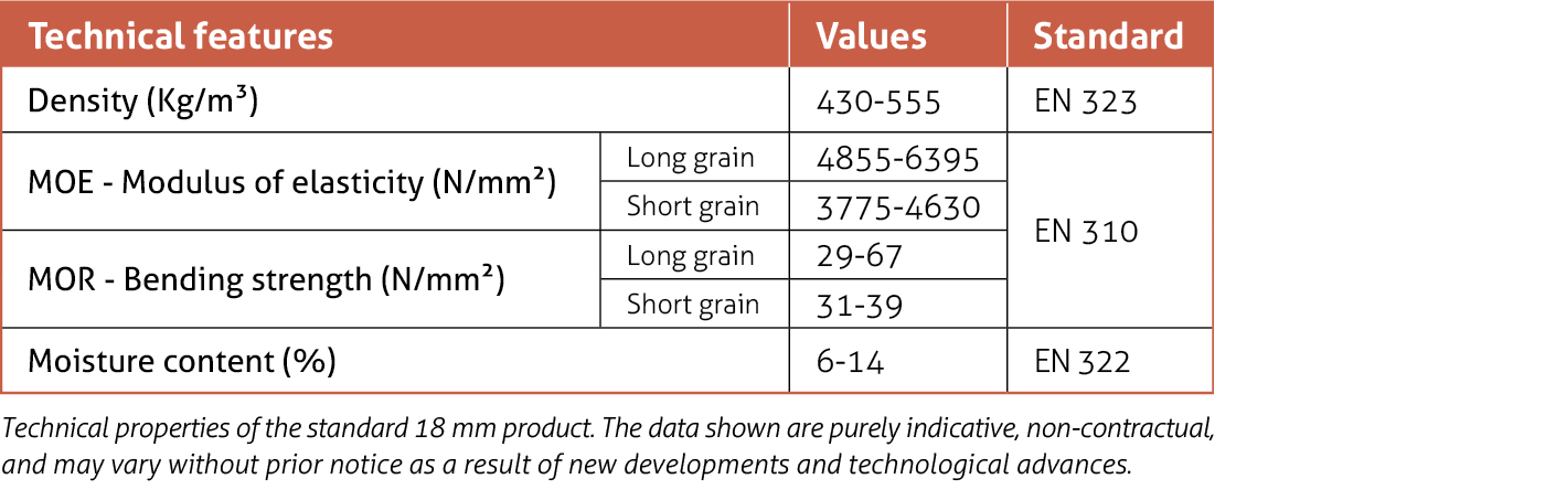The combination of species provides a stable and uniform core, ideal for interior applications that require a lightweight panel, easy machining, and excellent surface quality.