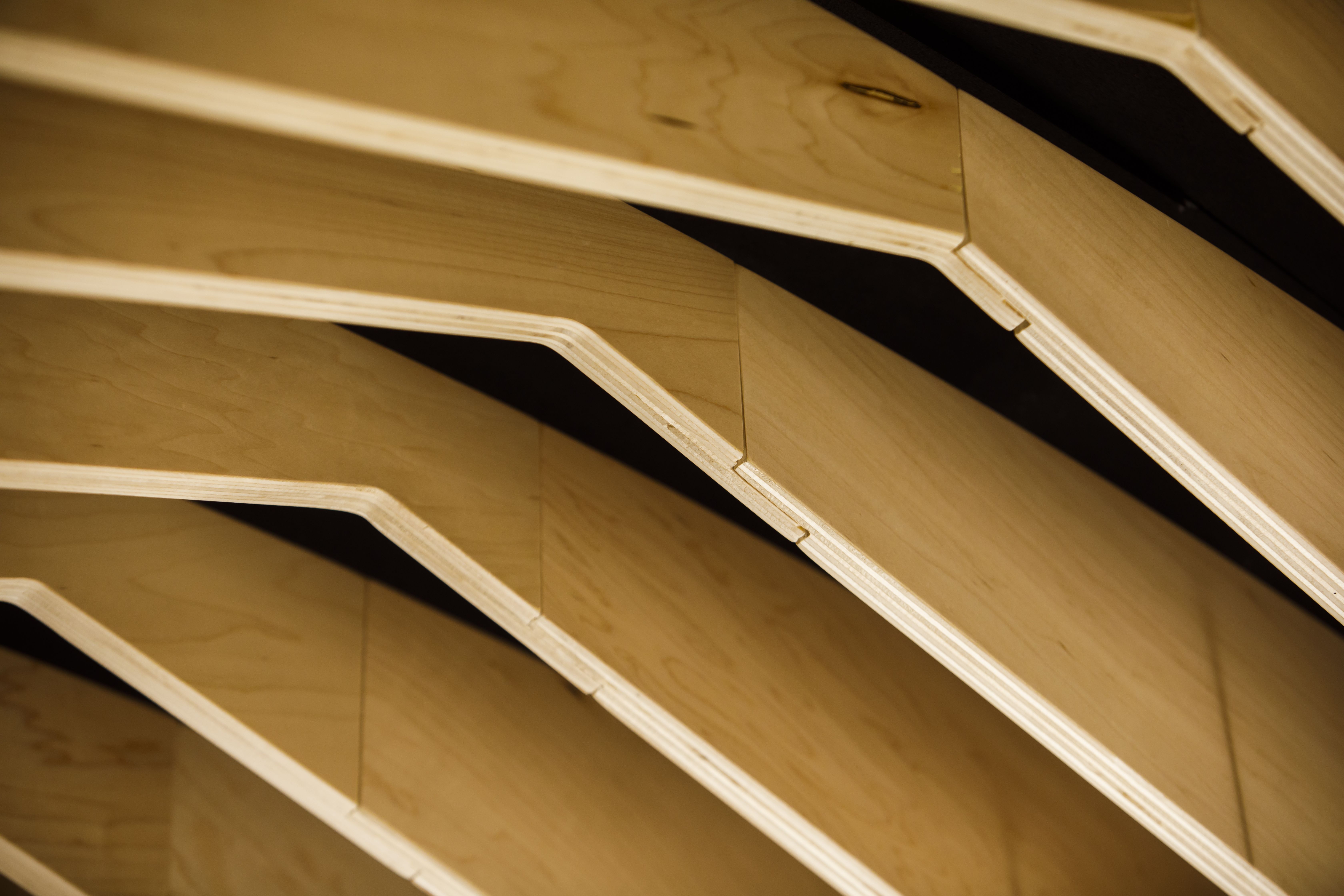 - TV room: curved and perforated panels, following the shape of the vaulted ceiling, showcasing the natural beauty of the plywood while absorbing sound.
