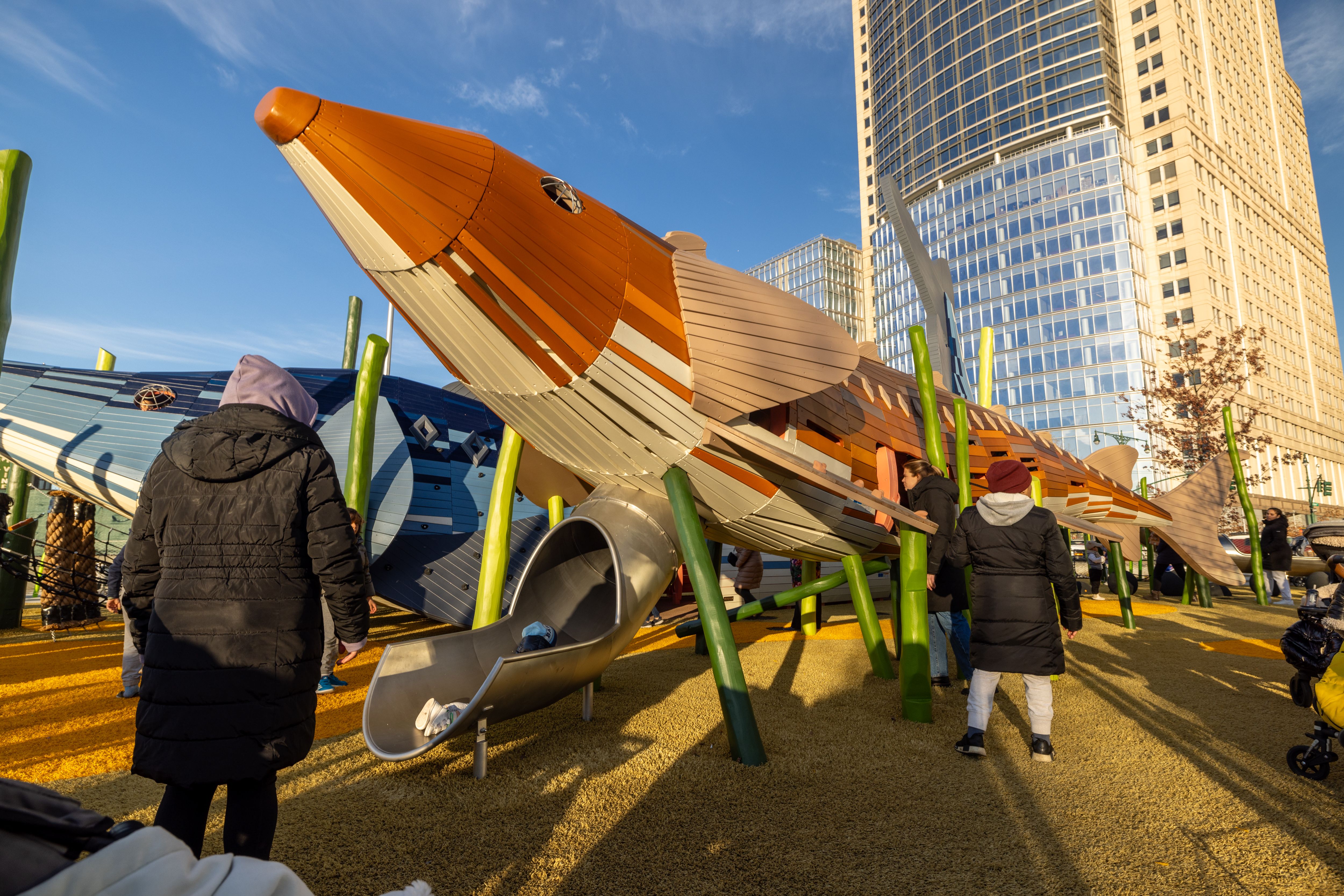 In 2024, the Pier 26 Science Playground opened in Hudson River Park, New York. This innovative space combines play, learning, and sculptural design. The project was developed in collaboration with landscape architecture studio OLIN, Hudson River Park Trust, and MONSTRUM Playgrounds, aiming to create an iconic playground inspired by the Hudson River’s marine life, while complementing the future Estuarium, a science center focused on river ecology.